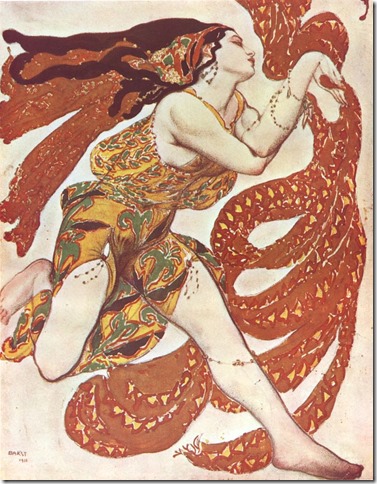 Bacchantes - the top one is a theatrical costume by Bakst - from Wikimedia Commons. Green dress from NYPL.
